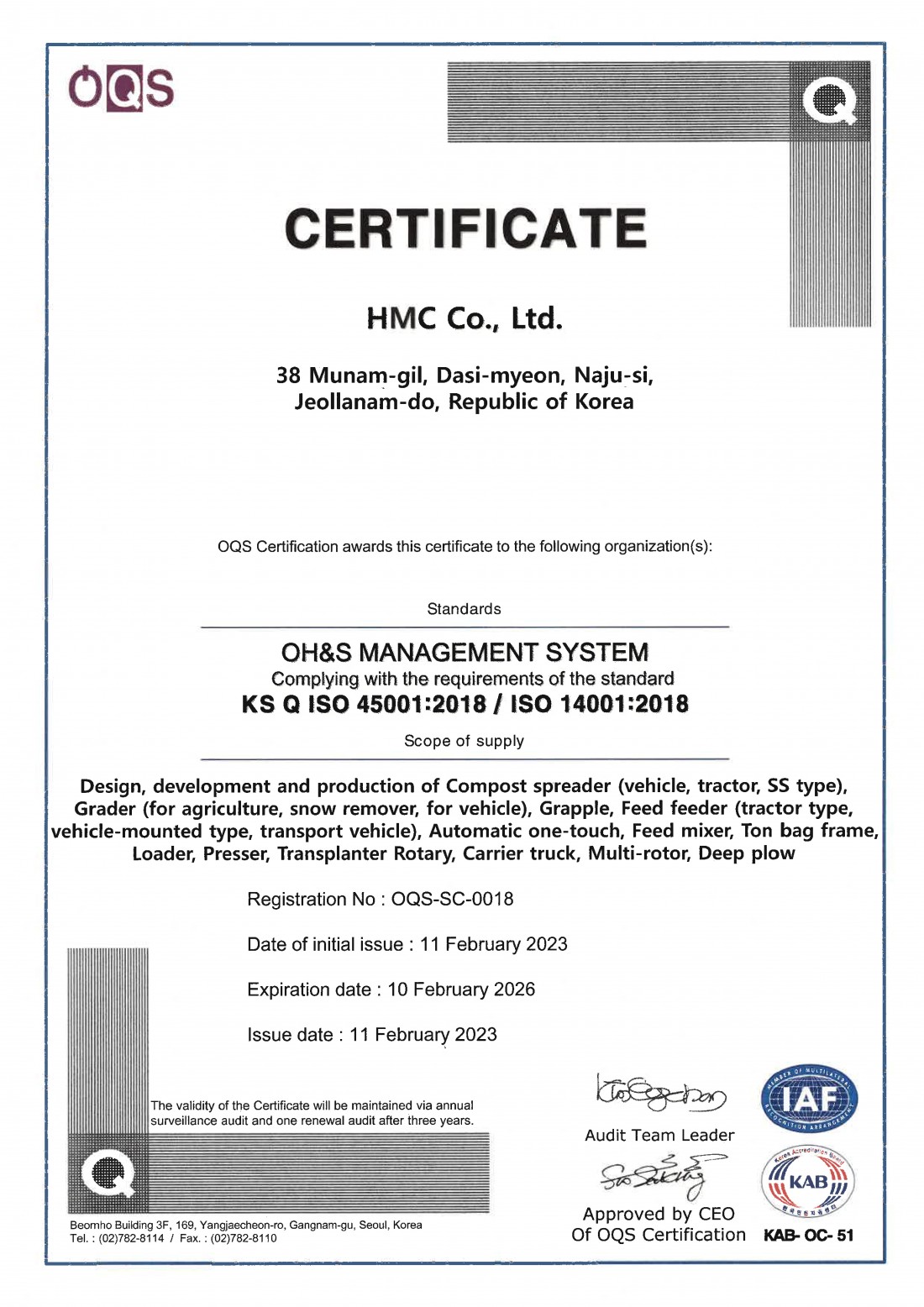 인증서 ISO45001 인증서(영문) 페이지 정보 작성자 관리자 댓글 댓글 0건 조회Hit 369회 작성일Date 25-08-29 11:36 본문 ISO45001 인증서(영문) 목록 이전글K-마크인증서 25.08.29 다음글ISO45001 인증서(국문) 25.08.29 댓글 0 댓글목록 등록된 댓글이 없습니다.