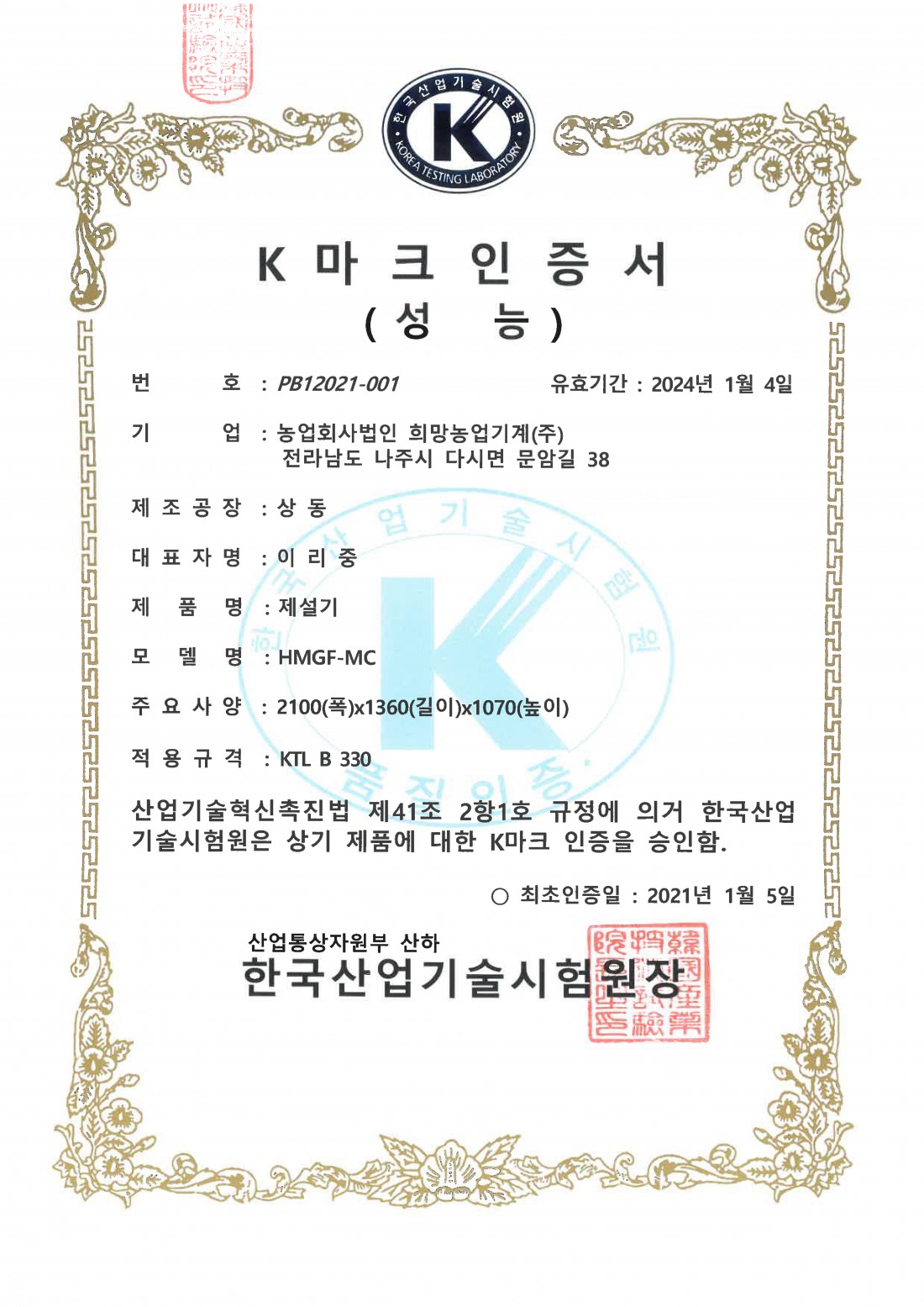 인증서 K-마크인증서 페이지 정보 작성자 관리자 댓글 댓글 0건 조회Hit 411회 작성일Date 25-08-29 11:37 본문 K-마크인증서 목록 이전글전라남도_나주시_투자협약서(MOA) 25.08.29 다음글ISO45001 인증서(영문) 25.08.29 댓글 0 댓글목록 등록된 댓글이 없습니다.
